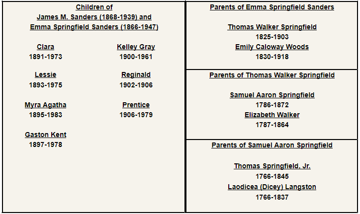 Emma Springfield was born 28 December 1866 in Lamar County, Alabama and died at 5 o’clock a.m. on 27 October, 1947 at her home near Vernon, Alabama. She married James Marshall Sanders on 23 December 1888. Emma, the ninth child of Thomas W. and Emily C. Woods Springfield was a school teacher. She received a third grade Teachers Certificate in 1887 and taught school for a while in an old one-room house called the “Sealy”house, which was located in front of the house George Harrison Sanders built, now called the Asa McCarver house and owned by Dan and Linda Pennington. Emma’s husband, James Marshall Sanders, built small wooden benches for the children to sit on. She also taught some in her home. Some of her students (ca. 1900-1910) were: Ora Cook (Jordan), Wilma Cook (Davis), Jeff Finch, Audie Finch, Donie(?) Williams, and of course, some of her own children. She taught her husband to read and write after they married. She was a community news correspondent to the local newspaper in Vernon, The Courier. She wrote poems, one of which was set to music and published. Emma was a very religious person with strong convictions.