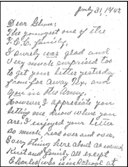 Emma Sanders was a very religious person with strong convictions as evidenced by her many inspirational songs and poems. Those strong convictions are also shown in the following letter she wrote to her grandson Glenn while he was stationed in Texas. It is believed this was one of her last letters. She died just three months after it had been written. Emma was also remembered within the family for her beautiful handwriting as seen in her poem “Memories” and in her letter to Glenn.